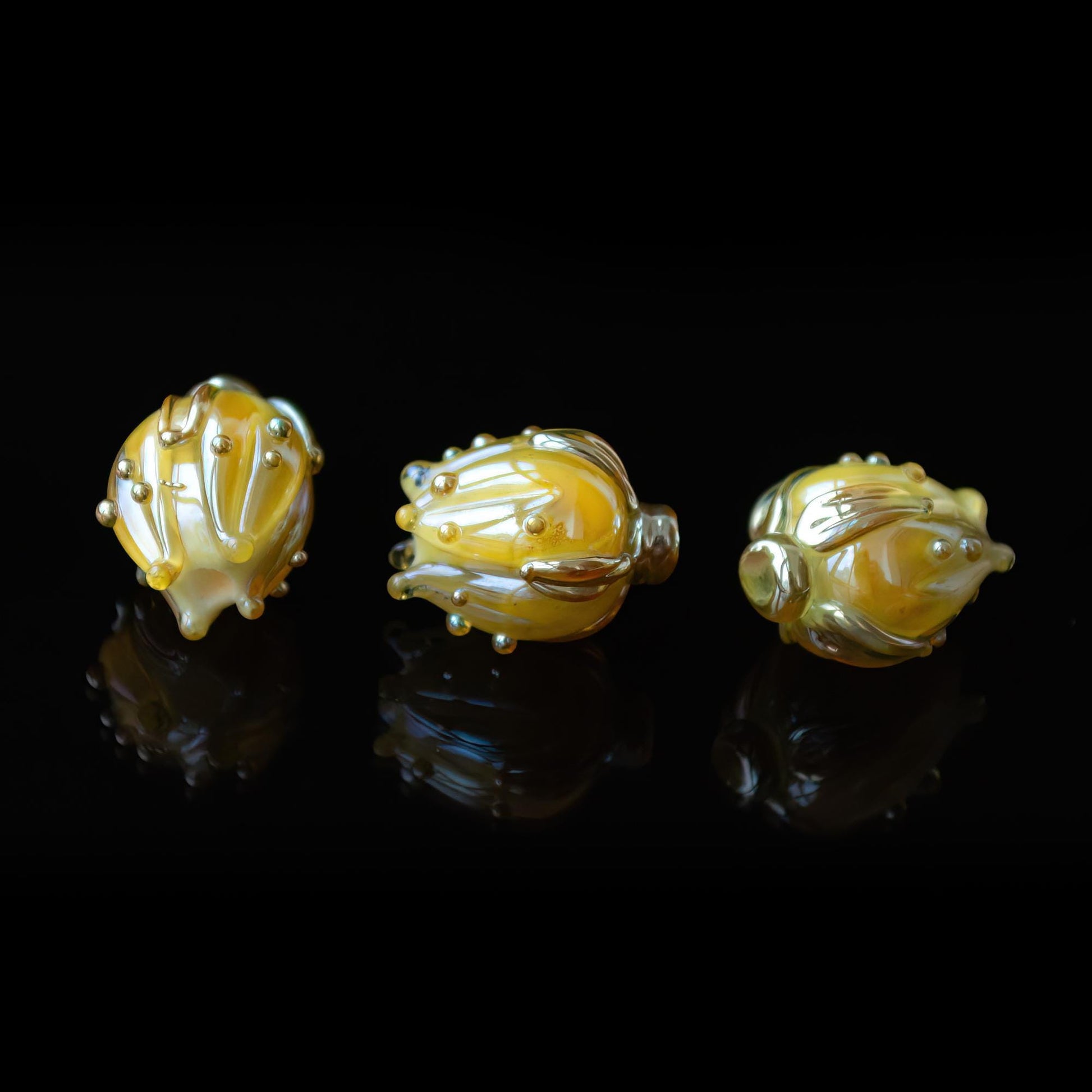 Brighten your jewelry creations with these handmade lampwork glass beads, shaped like tulip flower buds. These beads feature a vibrant yellow base enhanced with golden highlights and pearlescent details. Small decorative bumps add texture and a touch of elegance, making these beads a perfect choice for unique, nature-inspired designs.