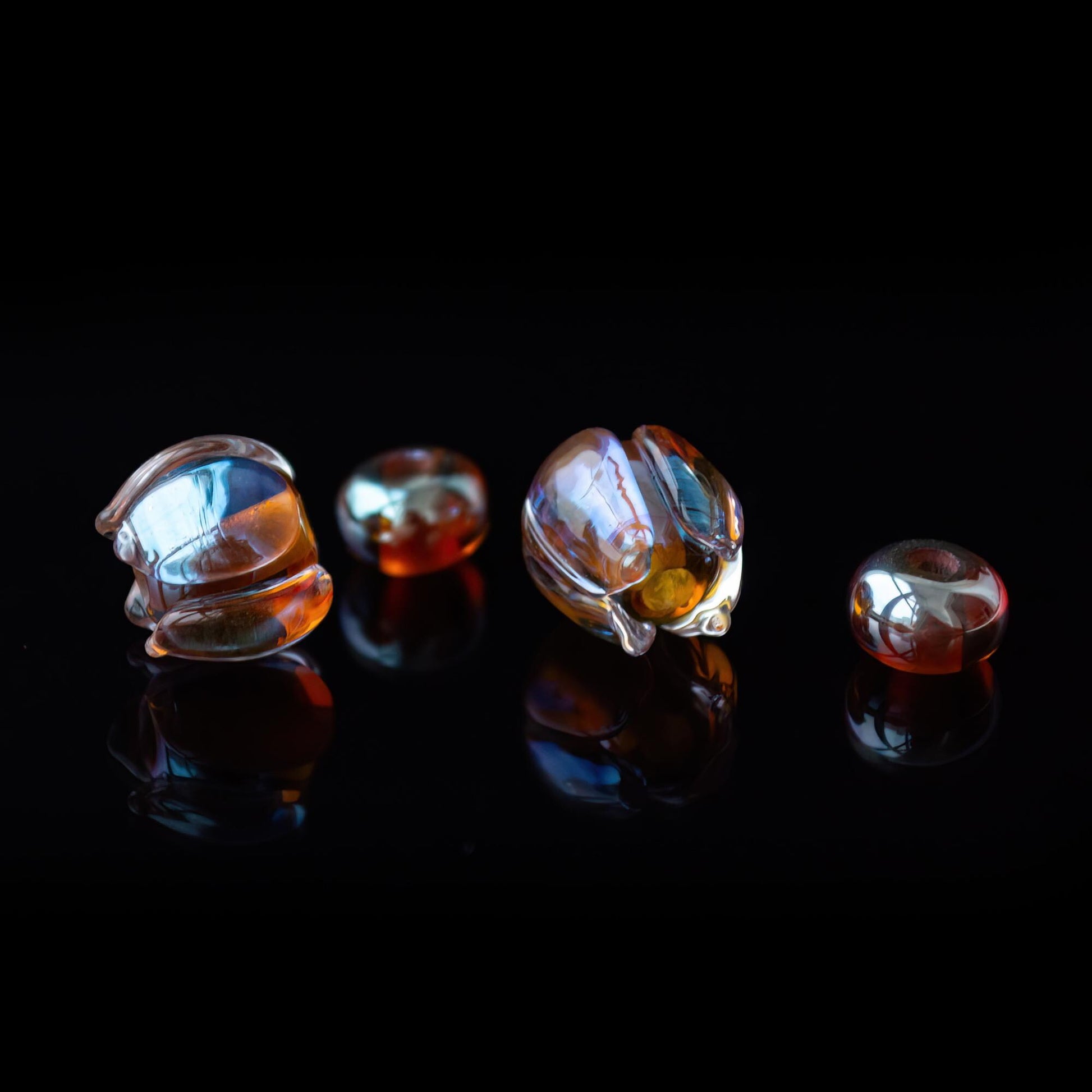 This set of 4 handmade glass lampwork beads features a beautiful mix of clear and amber tones with hints of iridescence. Perfect for jewelry making, these beads will elevate any necklace, bracelet, or earring design with their artisanal charm.