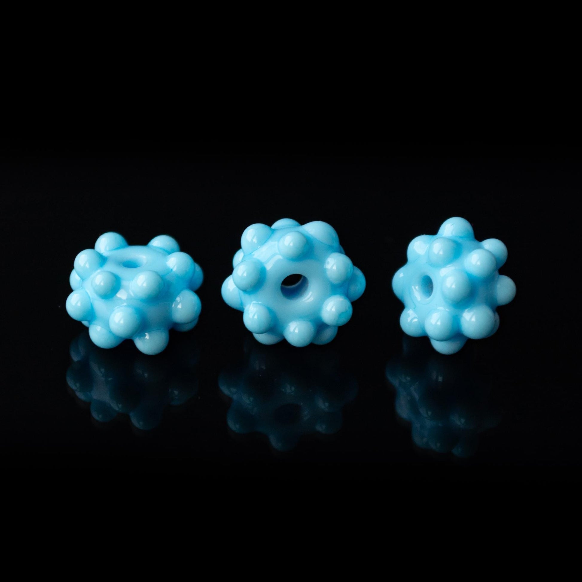 Add a playful and eye-catching touch to your jewelry designs with these handmade lampwork bumpy beads in a cheerful light blue color. Each bead is carefully crafted in flame-worked glass and features a round shape with evenly placed raised bumps, giving it a fun, bubbly texture.