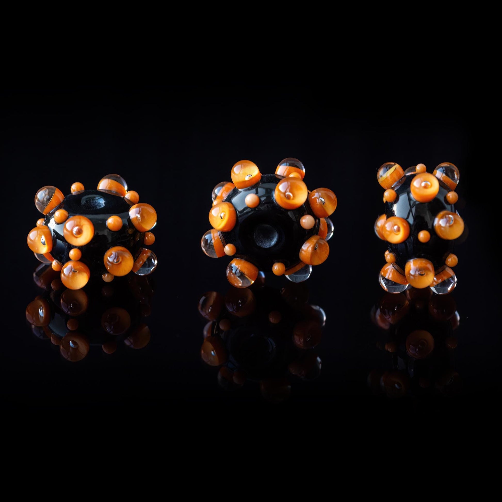 These glass beads are a striking combination of black and vibrant orange. The base of each bead is a deep, glossy black, with a donat shape. Surrounding the surface are raised, dome-like orange accents, evenly distributed across the bead