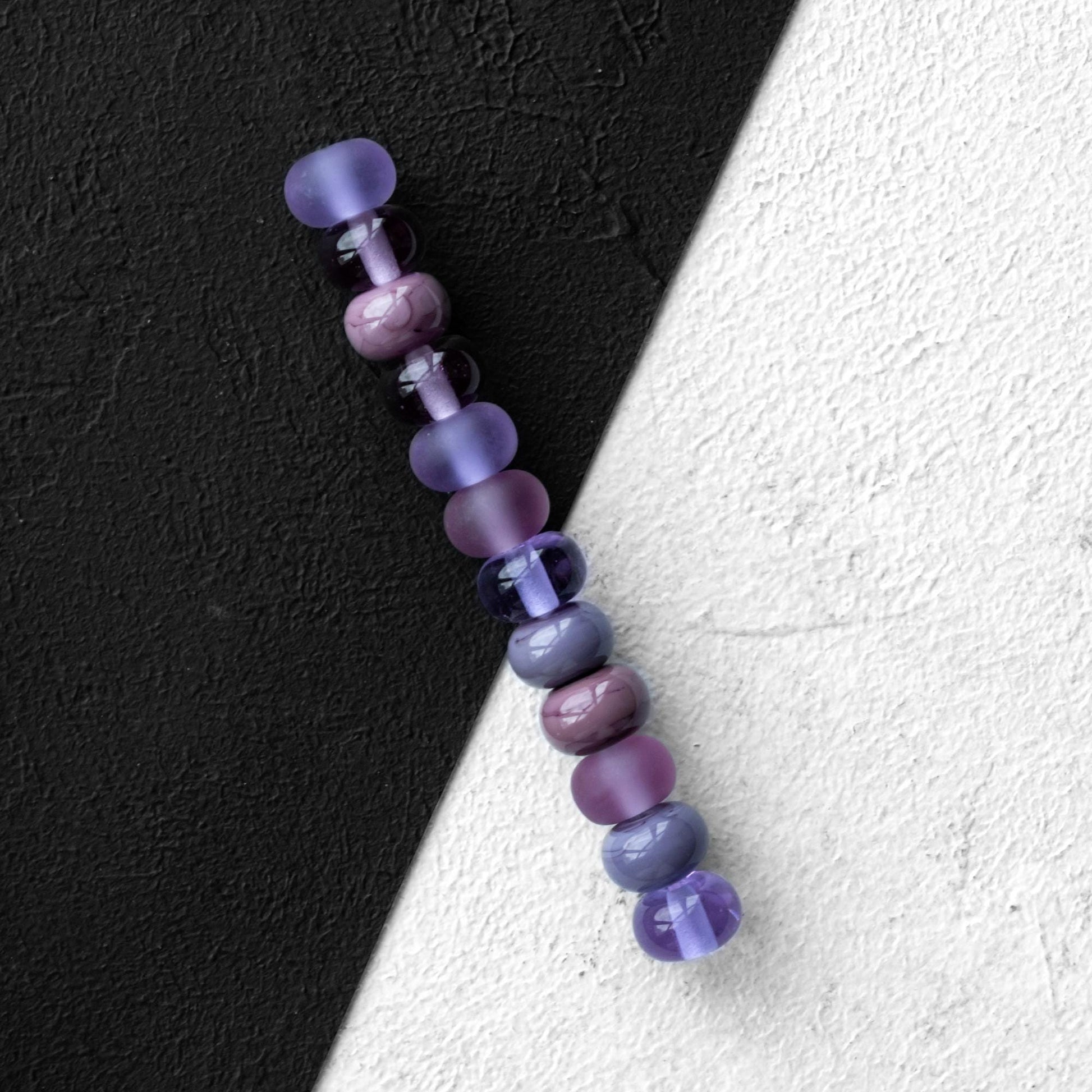 Add a dreamy touch to your creations with this set of artisan lampwork glass beads in elegant shades of lavender, lilac, pink, and violet. These handmade spacer beads feature a mix of matte and glossy finishes, transparent and opaque designs, as well as delicate swirls and soft gradients that create a magical, whimsical look.