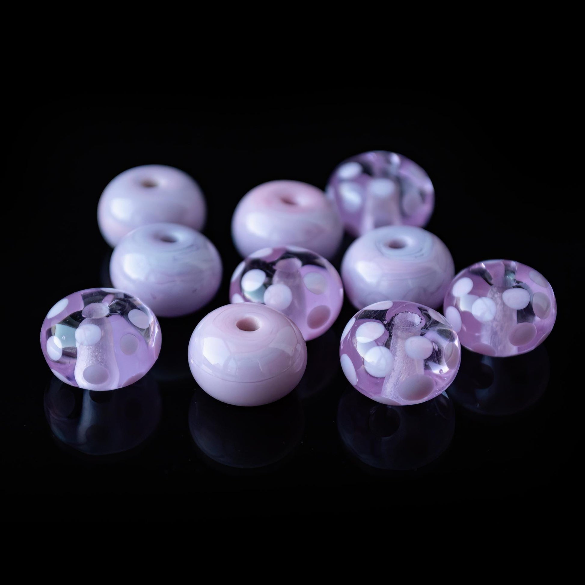 This unique set features 10 artisan lampwork glass beads in soft lavender and pink hues. Each bead is meticulously handcrafted with a combination of smooth solid colors and transparent glass with delicate polka-dot details, adding a playful yet elegant charm. Perfect for jewelry making, including bracelets, necklaces, or earrings, these beads bring a touch of sophistication and whimsy to your creations.