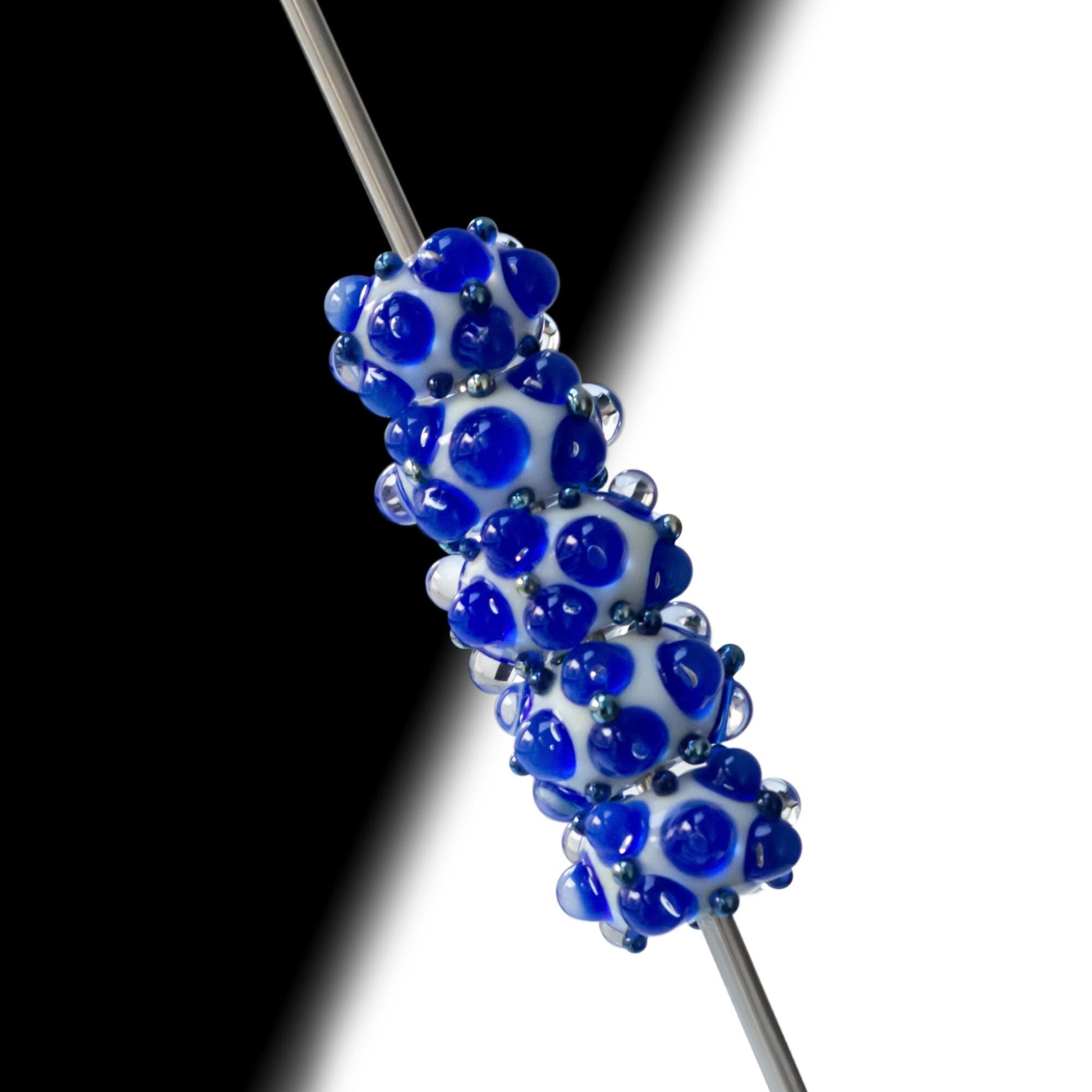 These unique handmade lampwork glass beads are sold individually, making them perfect for custom jewelry designs. Each bead features a white base adorned with raised blue dots and transparent accents, creating a playful bubble effect. Whether you're designing a statement necklace, a bracelet, or a charm, these artisan beads will add a dynamic and whimsical touch to your creation.