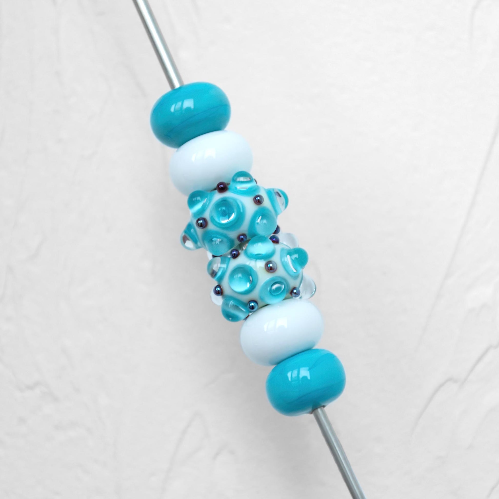 There are six beads in this set. Two of them are solid white, and two are solid blue. The other two beads have a white base and are adorned with blue raised elements and small sparkling accents, giving them a decorative, textured look. Perfect for creating necklaces, bracelets, or earrings, these beads are an excellent choice for jewelry makers seeking unique, high-quality components.